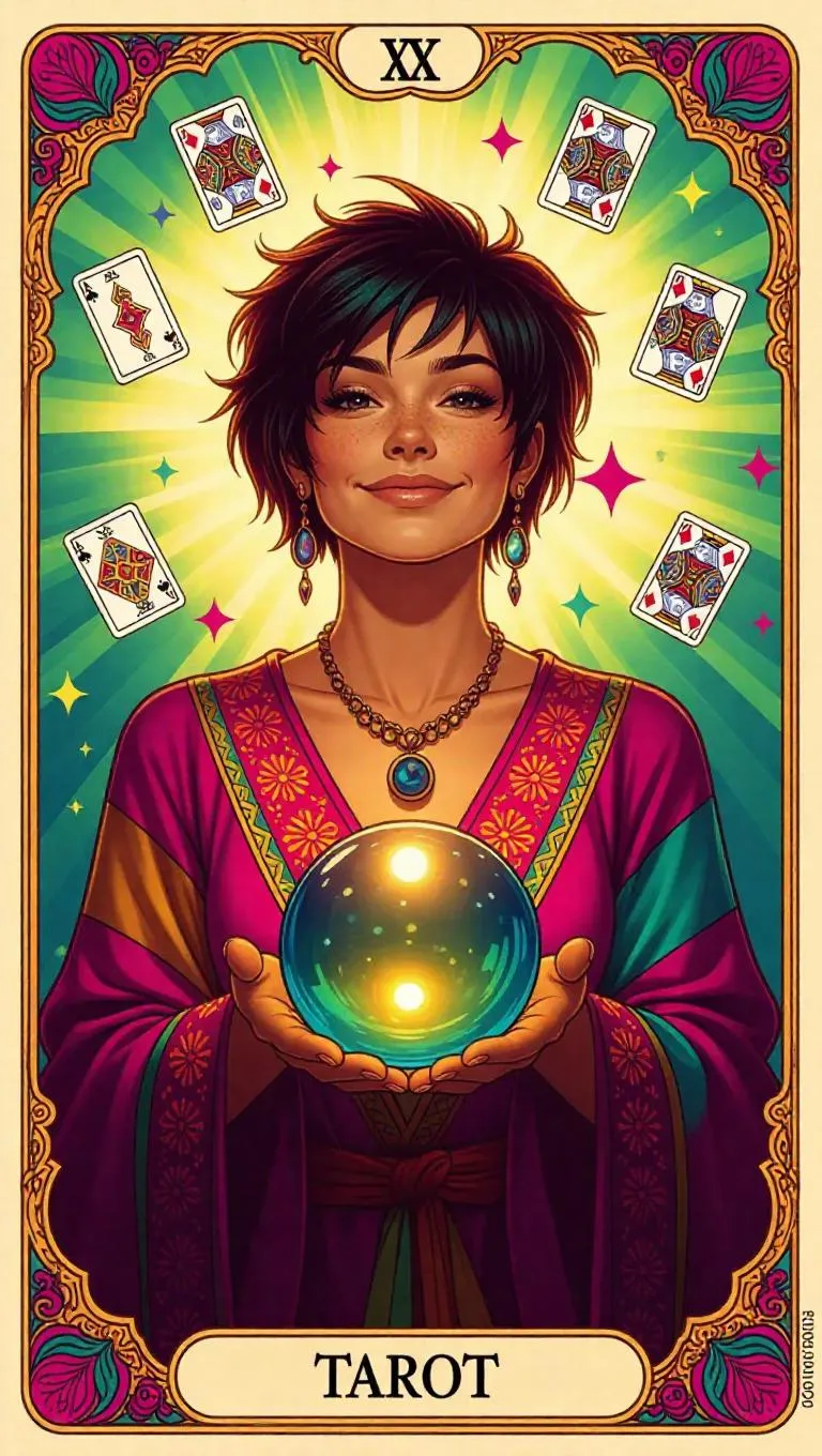 A tarot-themed card depicts a sighted fortune-teller with a glass sphere, surrounded by floating tarot cards. The fortune-teller wears a colorful, bohemian robe and has short, spiky hair. Her expression is playful and inviting. The scene is cheerful and vibrant, with a lively, warm glow. The card border features whimsical doodles and Folk Art-inspired motifs, adding a fun element. Bright, sunny light bathes the scene, enhancing the joyful atmosphere. Style: Folk Art, Whimsical.