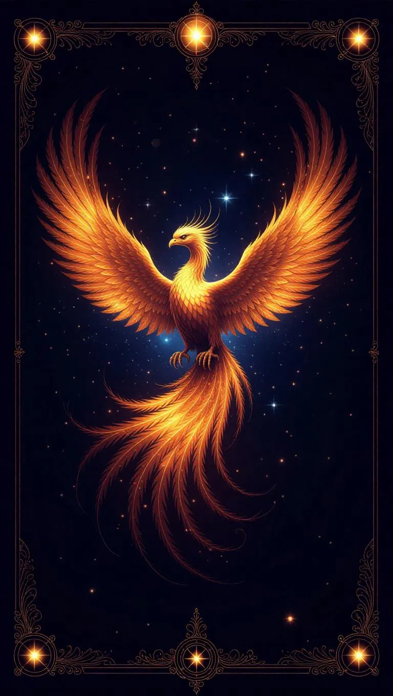 A celestial phoenix rises from stardust, its feathers ablaze with nebula flames. Supernovas and glimmering stars fill the card background, while the frame shines with bright galaxy colors and aurora effects, adorned with magical runes. Soft, bright light illuminates the phoenix, casting a glow that highlights the intricate details of its wings. The style is luminescent and ethereal, blending realism with cosmic elements.