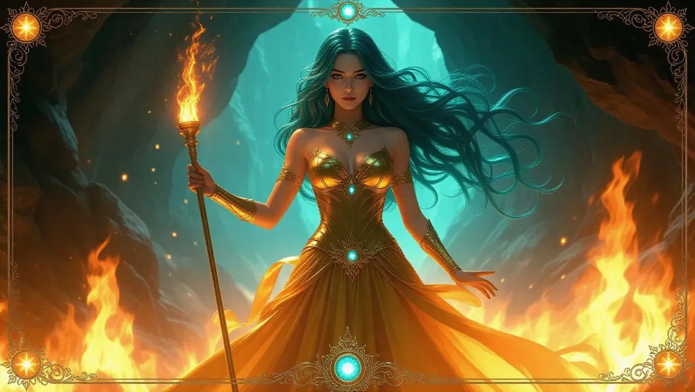 A fiery goddess with cascading teal hair, wearing a molten gold gown that captures light perfectly. She holds a blazing torch while standing amidst roaring flames. The background showcases a mystical cave with glowing stones. The card border integrates intricate flame and sunburst motifs, accented with light teal and radiant gold, and adorned with radiant topaz.