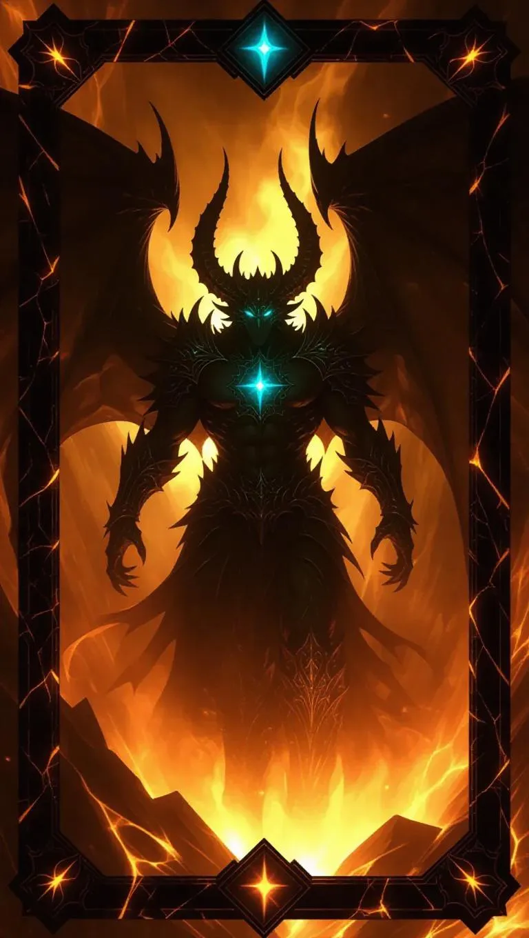 A shadowy demon lord rises from an abyss of despair, his massive wings opened wide, gleaming turquoise horns sparking, and glowing umber cracks adorning his colossal figure. Hellfire and mayhem encircle him, with ominous inscriptions and a dense black border featuring sparkling lava cracks framing the scene. An ancient card emblem in the corner adds to the otherworldly essence. Multifaceted lighting and strong shadows intensify the captivating card effect.