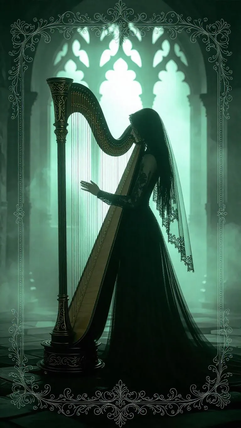 A ghostly harpist in flowing emerald gowns plays a cursed melody, summoning flickering spirits and ethereal lights. The scene is filled with ghostly mist, framed by silver accents adorned with ancient musical notations. Soft, enchanting light enhances the lace quality of the gowns and apparitions, creating a hauntingly beautiful atmosphere. The style is enchanting and mystical, blending realism with supernatural elements.