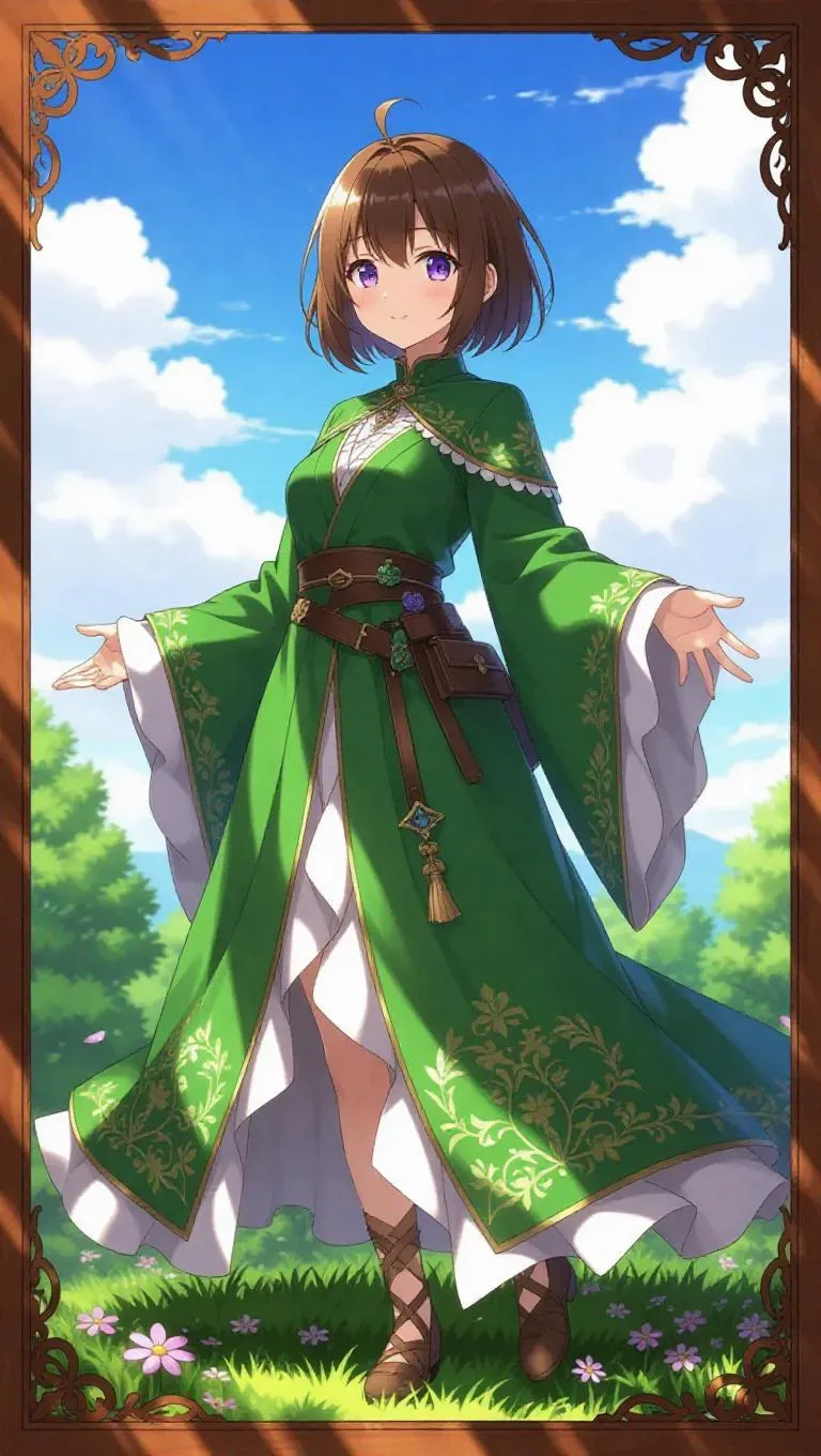 A peaceful anime-style female mage, adorned in flowing green robes with delicate white trim, stands in a relaxed pose. Her short brown hair shines with a gentle luster, and her violet eyes convey wisdom. The background features a bright daylight sky with fluffy clouds. The scene is framed by an elegant wooden border with nature-inspired carvings and a warm shimmer.