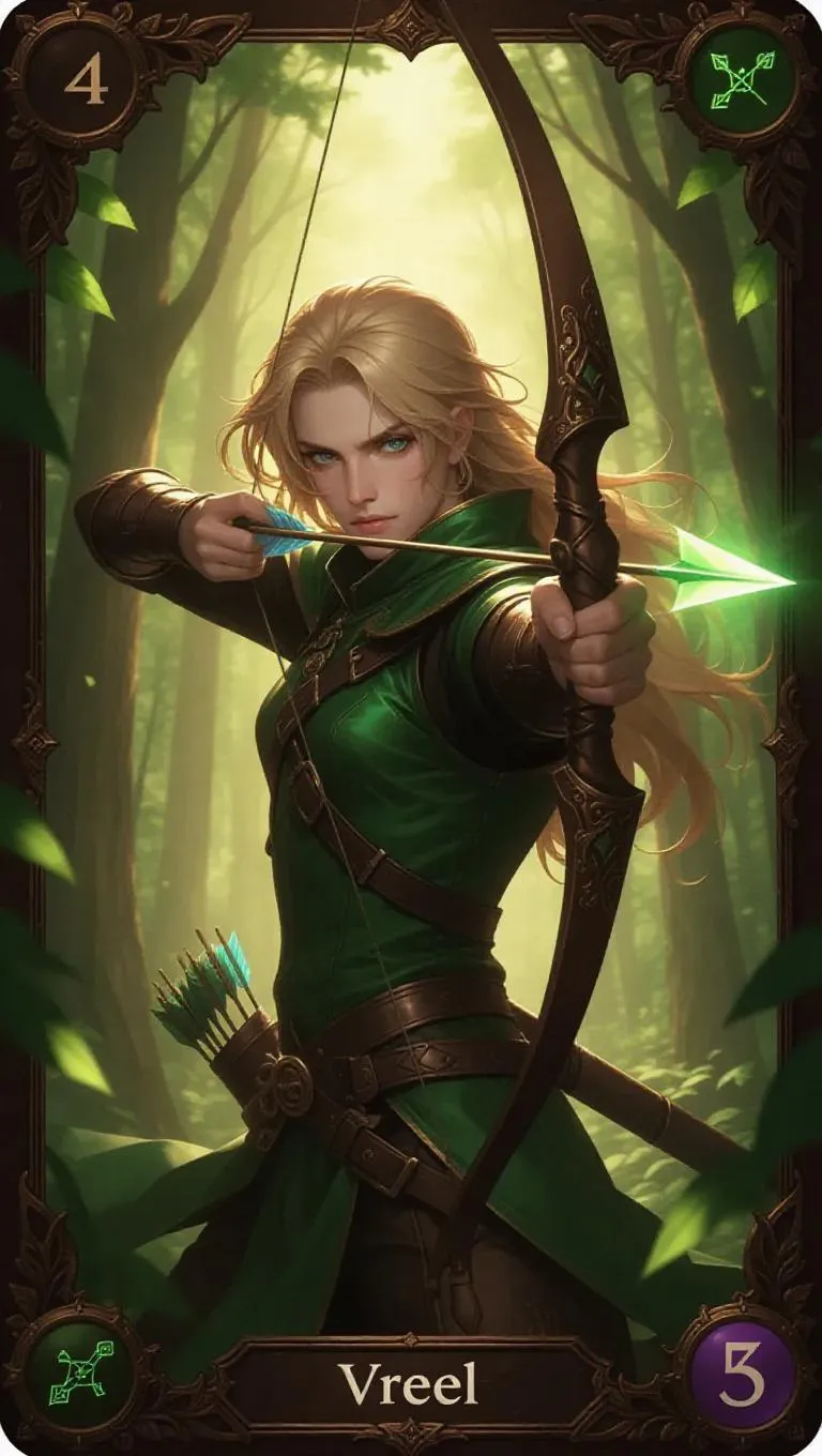 A resolute archer with wind-swept blonde hair and a forest green aura aims through dark energy. His bow glows as energy arrows whip around him. The scene is set against a tranquil forest, with sunlight filtering in through the leaves in the background. The card is framed with rustic brown borders, adorned with leaf icons and bow emblems, creating a high-quality SSR archer card effect. The lighting is dappled and natural, casting delicate shadows and enhancing the focused action. The style is a blend of nature and mystical aesthetics.