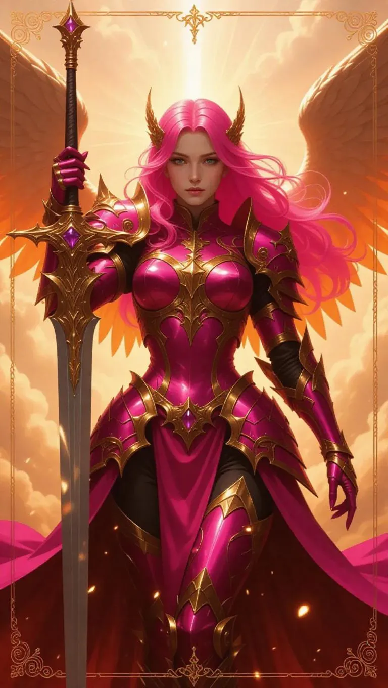 A heroic pink-haired battle angel, clad in fiery orange armor and adorned with pearlescent wings, holds a divine blade aloft. Sun beams and wispy clouds fill the background, creating a vibrant atmosphere. The card is bordered with scriptural designs, featuring twinkling effects and orange holographics, enhancing the divine aura.