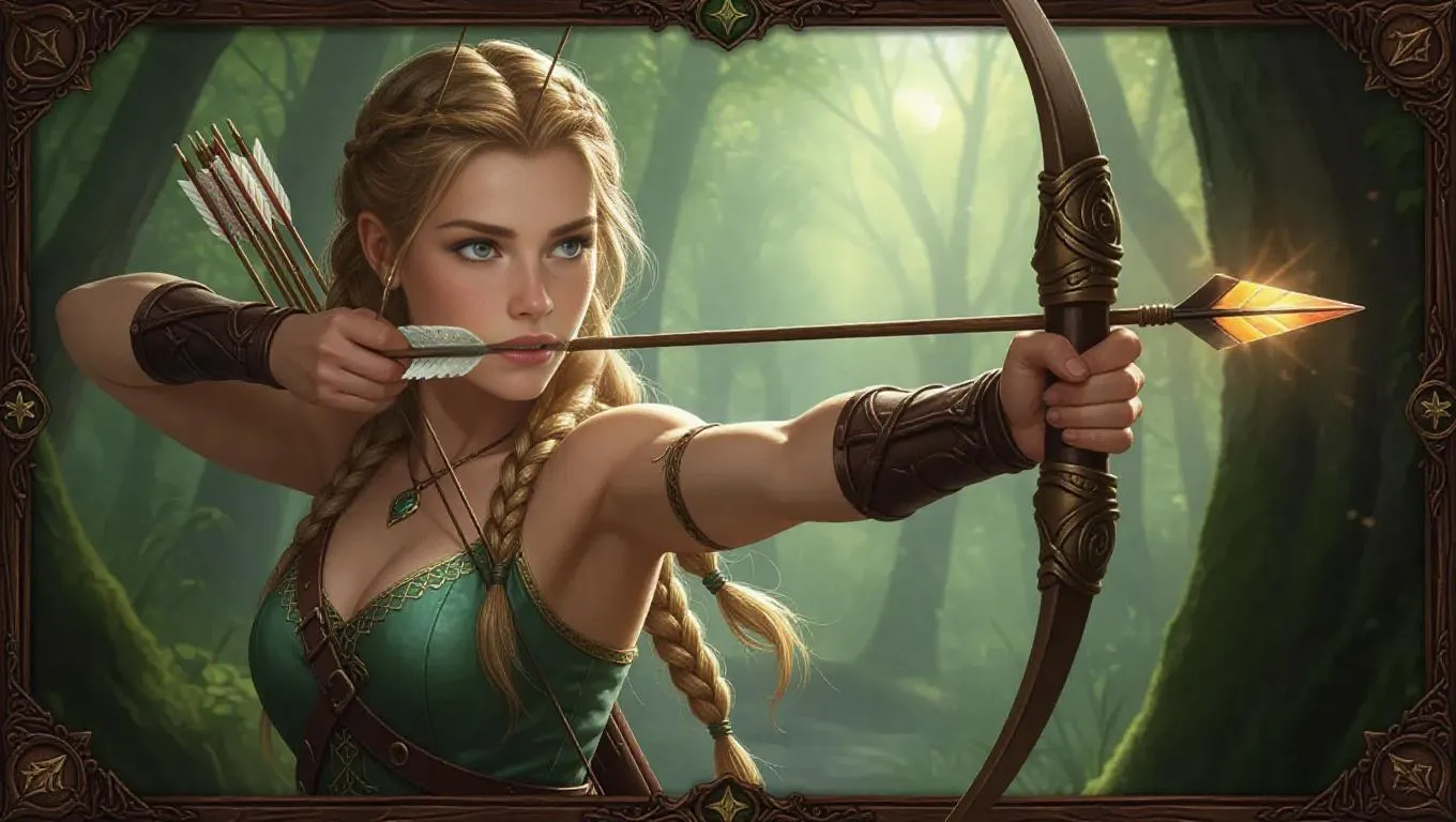 A youthful female archer with braided blonde hair and sharp, focused green eyes, clad in a flowing dress with a quiver of arrows and an ornate bow. She takes aim, and a magical arrow with a glowing tip is poised for release. The dense forest background features ancient trees and whispering winds, framed by a rustic wooden border adorned with nature patterns and hunting insignias, exuding a natural, earthy texture. Soft lighting, subtle glows, and a sense of adventure create a captivating collectible card game-style image.
