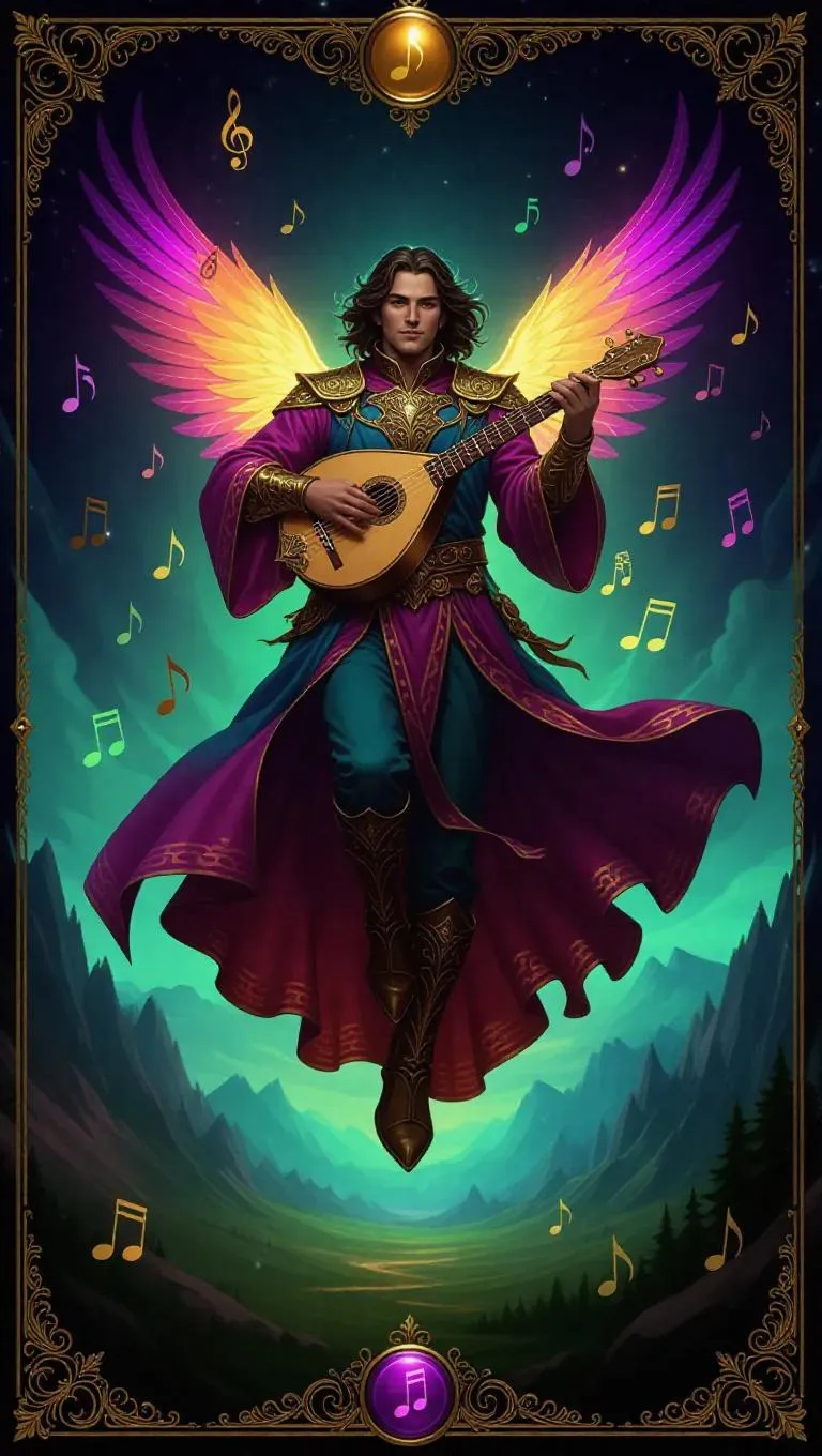 A celestial bard floats solemnly in the air, wings like musical notes, and a lute glowing with harmonious chords. His robes burst with color, and the background merges into a dreamy landscape. The game card features a music-themed border with soundwave patterns, gold foil textures, and an enchanting melody glow.