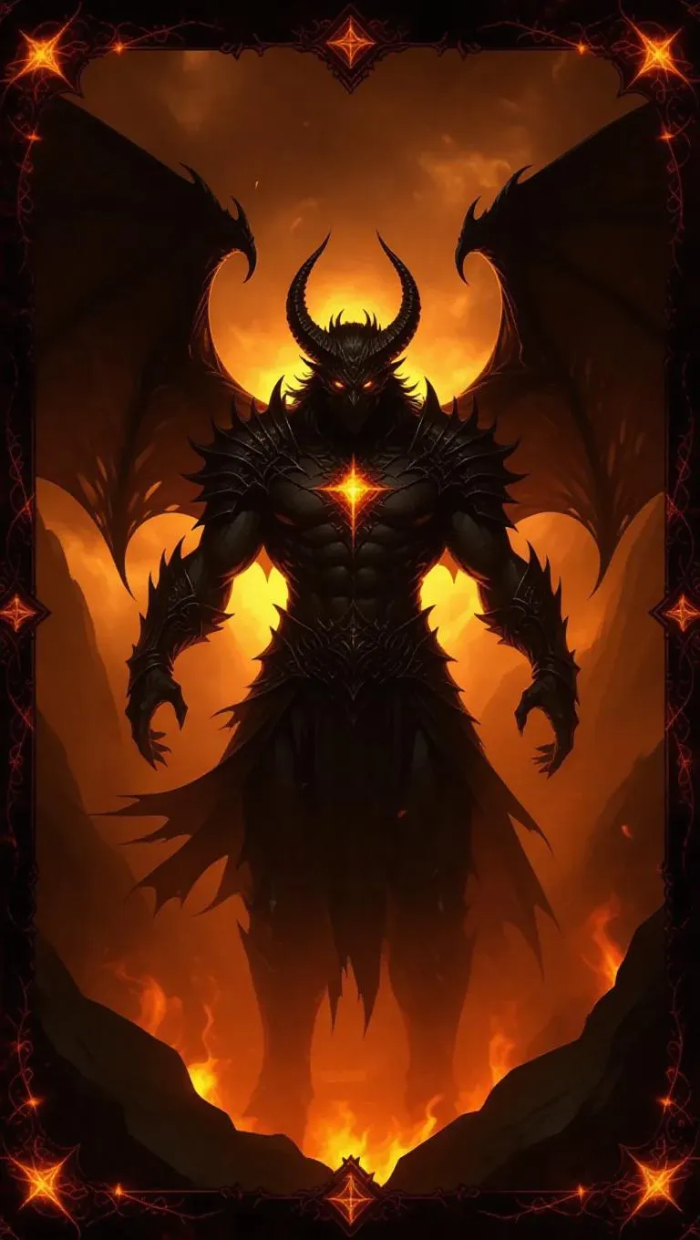 A shadowy demon lord emerges from a pit of shadows, his great wings flapping, radiant orange horns illuminating, and glowing sapphire cracks traversing his bulky silhouette. Hellfire and destruction surround him, with wicked runes and a heavy coal-black border decorated with lava cracks framing the scene. A legendary card emblem in the corner contributes to the enchanting atmosphere. Filtered lighting and stark shadows increase the dramatic card effect.
