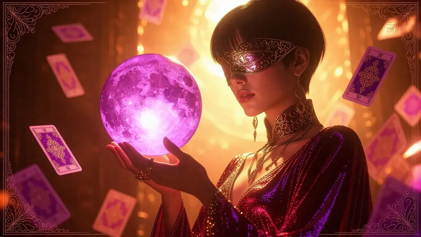 A tarot-themed card depicts a blindfolded fortune-teller with a radiant crystal ball, surrounded by cascading tarot cards. The fortune-teller wears a shimmering, jeweled robe and has short, sleek hair. Her expression is insightful and wise. The scene is captivating and surreal, with a vibrant, jewel-toned glow. The card border features ornate filigree and Byzantine-inspired elements, adding a luxurious feel. Warm, encompassing light bathes the scene, enhancing the lavish atmosphere. Style: High Fantasy, Byzantine.