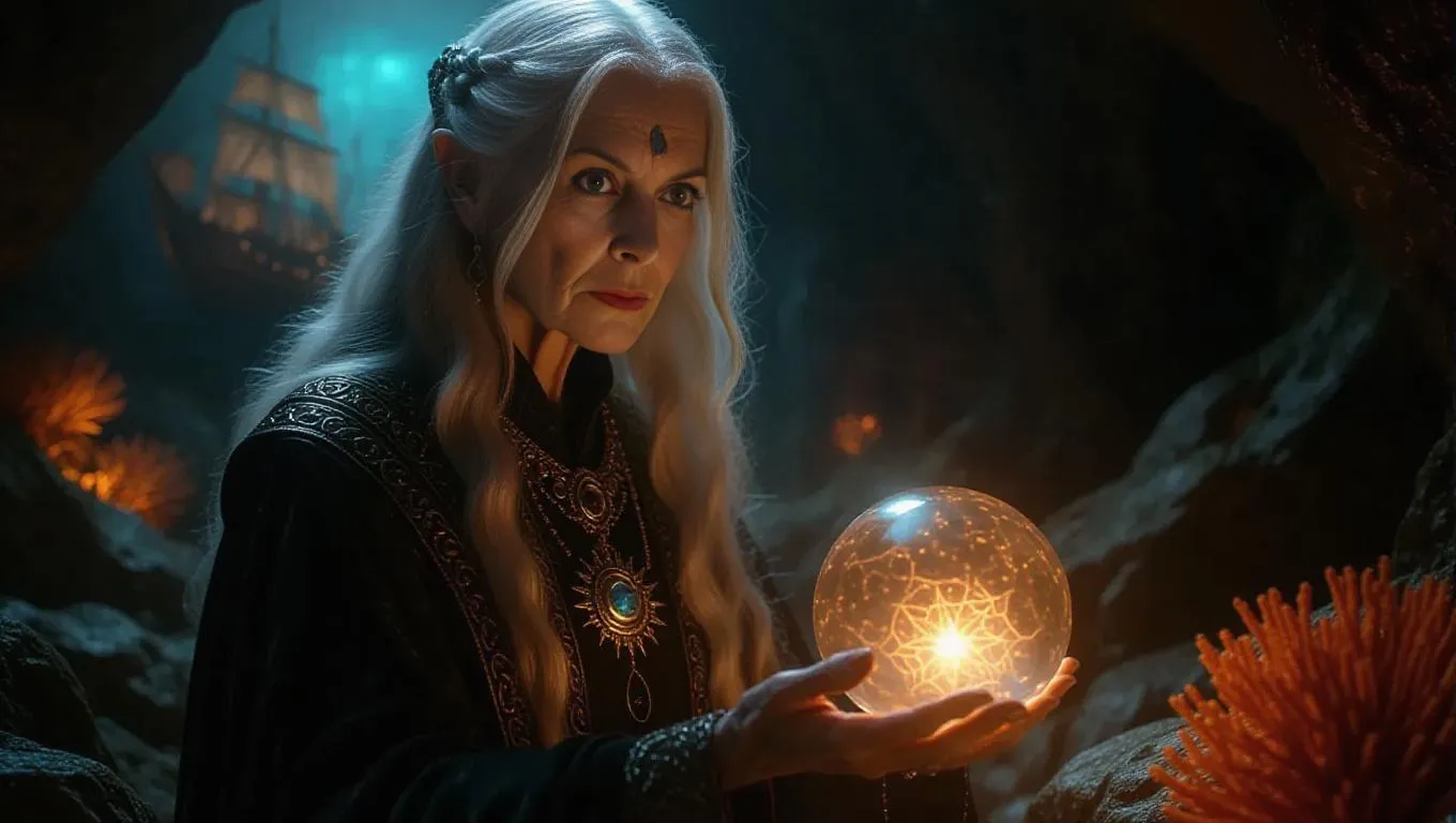 A wise female oracle with long, silver hair and piercing, all-seeing onyx eyes, robed in a flowing garment adorned with ocean symbols and a crystal ball. She gazes into the future, surrounded by swirling mist and glimpses of different timelines. The mystical cave background features glowing corals and ancient ships, encased in an ornate stone border with divination symbols and oracle emblems, exuding a rich, aged texture. Ethereal glows and deep-sea, mysterious lighting enhance the sense of prophecy, creating a captivating scene reminiscent of collectible card games.