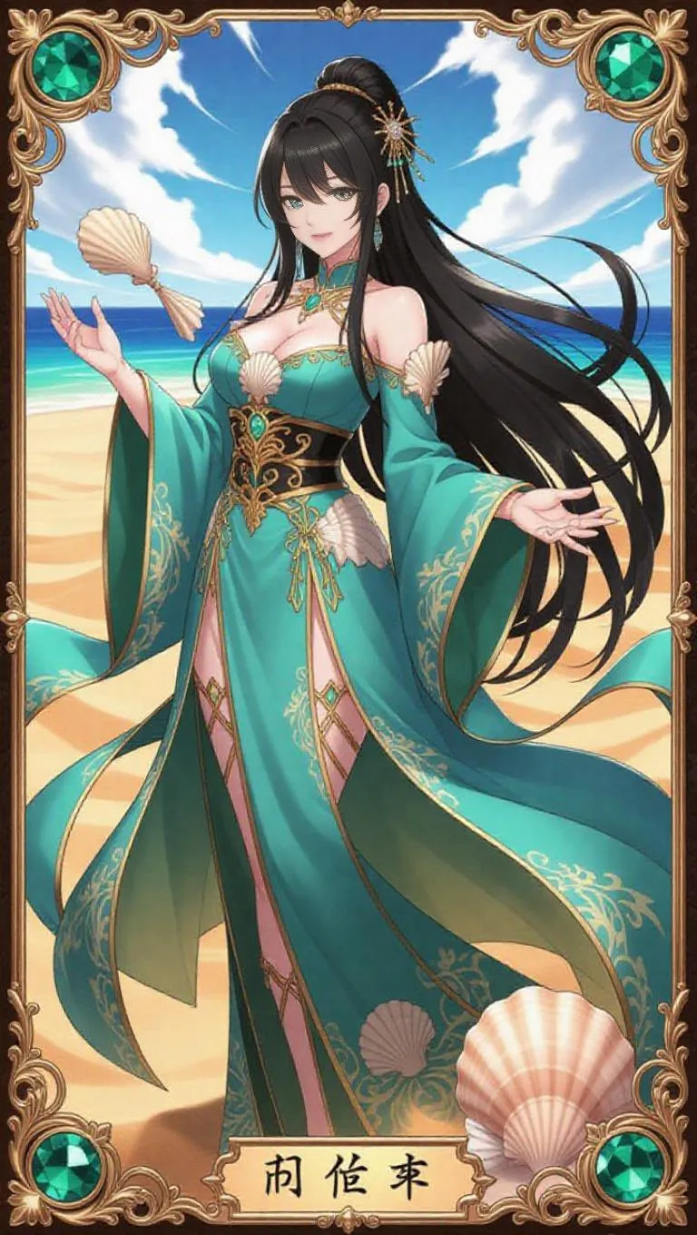 A majestic anime-style female empress, dressed in a flowing light blue and gold robe adorned with intricate shell motifs, stands in an inviting pose. Her long black hair is styled with elegant golden hairpins, and her glowing teal eyes radiate unparalleled power. The background showcases a swirling shell and sandy shores. The card border is ornate, featuring intricate shell and shore patterns, engraved Chinese characters, a holographic shimmer, and accented with jade gemstones and golden filigree.