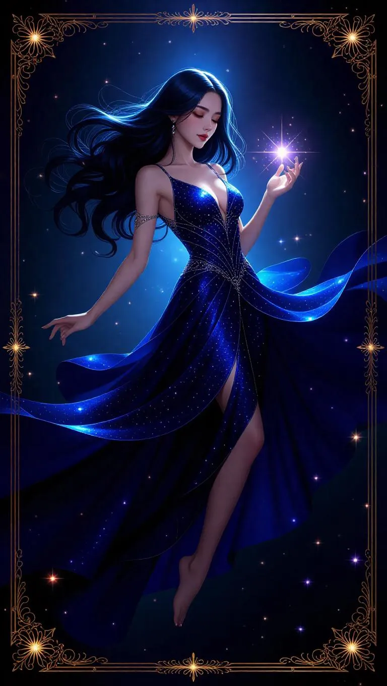 A celestial sorceress floats in space, her long indigo hair blending seamlessly with the cosmos. She wears a dress woven from galaxies, casting radiant star spells from her fingertips. The background features intricate constellations, while the card is framed with a platinum border adorned with soft glows and glimmering textures. Soft, warm light illuminates her from the front, creating a gentle contrast with the dark, star-studded backdrop. The style is ethereal and fantastical, blending realism with magical elements.