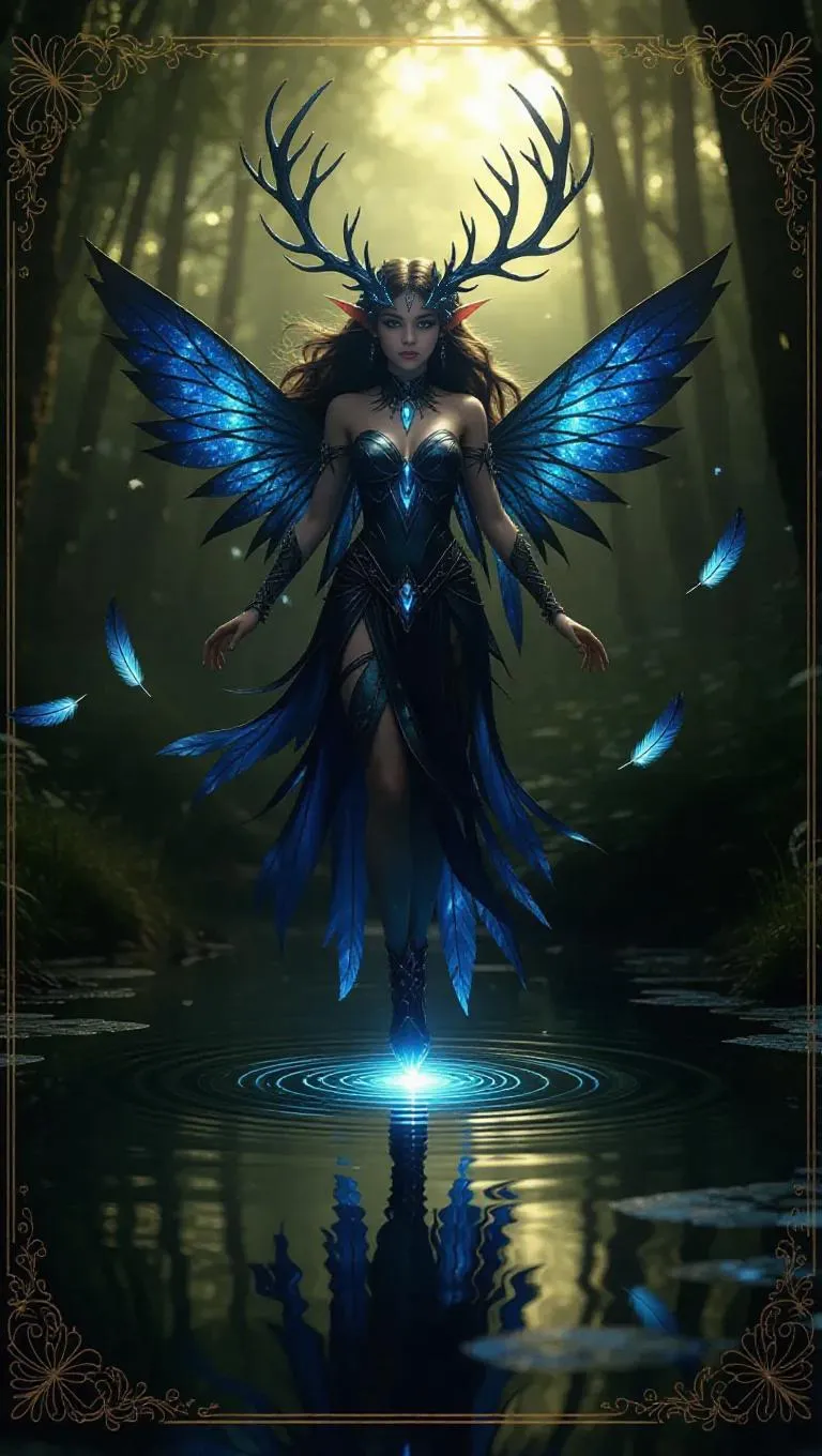 A forest spirit girl with indigo crystal antlers floats over a magical pond, surrounded by swirling lights and floating feathers. Her ethereal form is adorned with aglow, flowing silks, and her eyes sparkle with a deep, mystical shimmer. The pond reflects the enchanting forest, with filtered, soft sunlight illuminating the scene. The collectible card features nature-themed filigree borders, bird emblems, and a luminous indigo-gold holographic shine, enhancing the ultra-detailed enchanted forest background.
