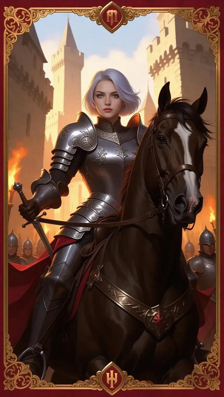 A dedicated female paladin with short, silvery hair and bold violet eyes, armored in a brilliant suit of silver armor with crimson highlights and a flowing tabard. She rides a noble charger, galloping into the fray with a shield raised high. The background depicts a medieval city under siege with towering walls and burning torches, surrounded by an ornate gold border featuring heraldic insignias and noble symbols. Radiant lighting, strong shadows, and a heroic, determined spirit create an awe-inspiring visual in the style of classic adventure stories.