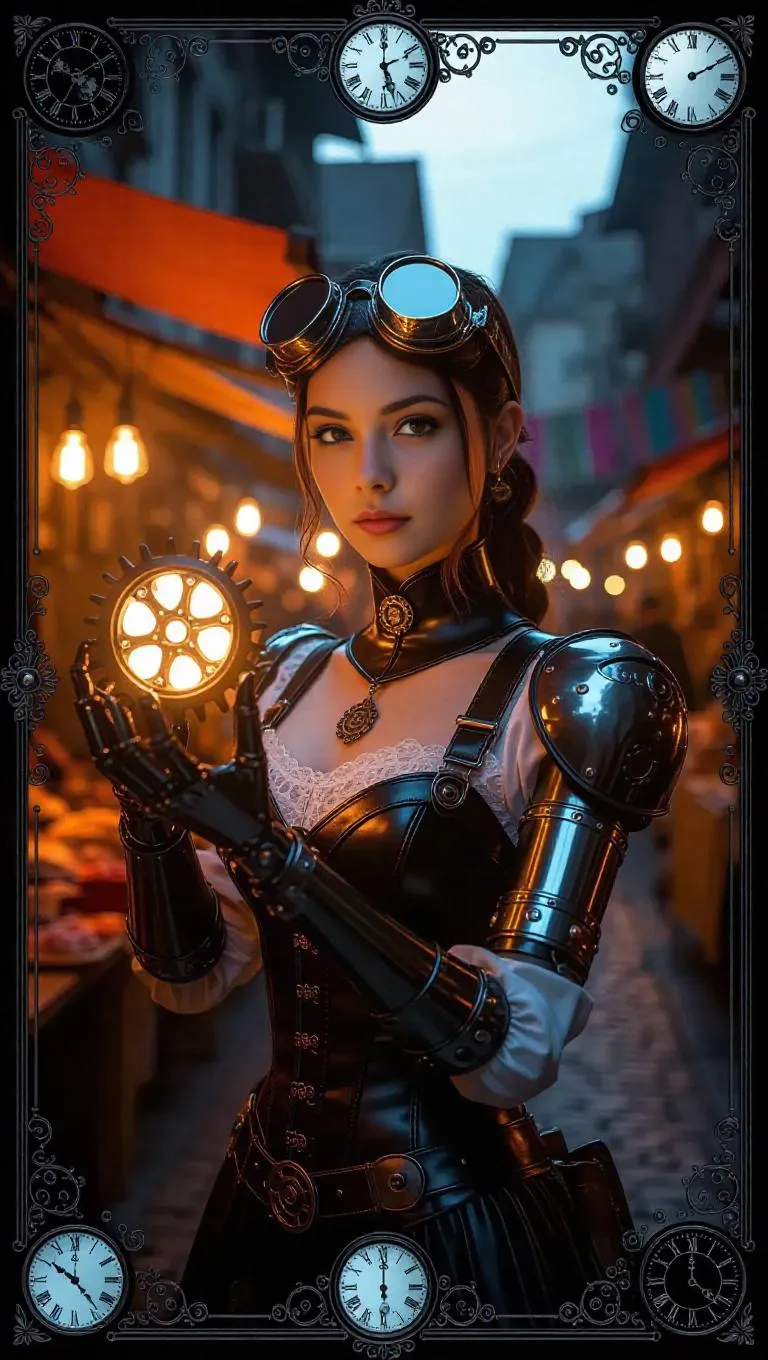 A steampunk inventor girl with a mechanical arm and aviator goggles holds a glowing gear-powered device. She stands in front of a bustling market filled with stalls and colorful fabrics. The scene is framed with silver-themed borders and clock motifs, bathed in a twilight glow. Detailed mechanical textures and retro postcard design elements enhance the vibrant atmosphere. Bright, warm side light highlights her inventive spirit and the intricate gears, creating an energetic yet historic feel.