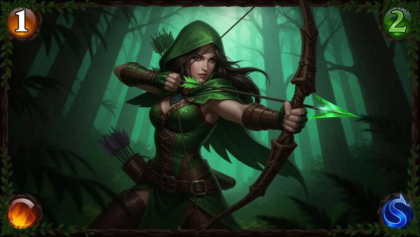 An agile huntress emerges from the shadows, wings camouflaged with foliage, and a bow glowing with a hunter's magic. Her rugged garb blends with the woods, and the background shows a dense thicket. The game card features a wilderness-themed border with bark patterns, earthy foil textures, and a tranquil green glow.