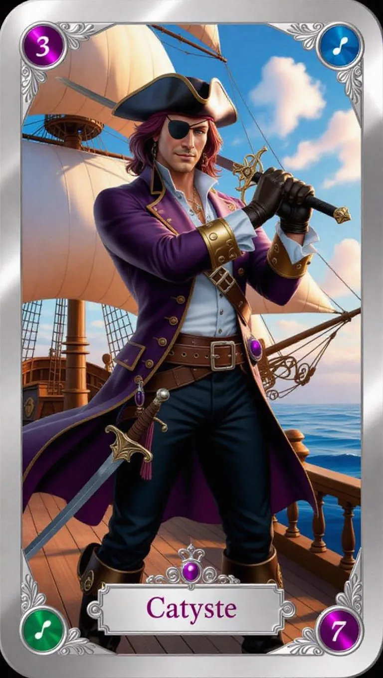 A heroic male pirate with slick, medium-length auburn hair and a captivating, sparkling violet eye (with an elaborate eyepatch on the other), dressed in tailored attire, dark trousers, and a jaunty cap. He wields a magnificent sword and clutches an intricate artifact, standing on the deck of a magnificent ship with grand sails and a peaceful, gleaming sea in the background. The card is framed by a platinum border adorned with royal insignia and ornate jewels, featuring a glassy, smooth texture. The image is vibrantly detailed, with clear, bright lighting, timeless water effects, and an inspiring, adventurous spirit, presenting an exquisite masterpiece in the style of collectible card games.
