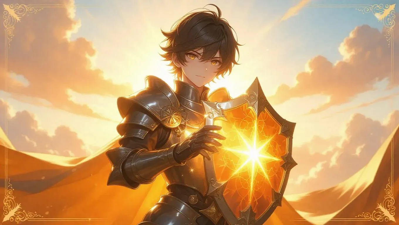 A young paladin with short brown hair and an orange aura stands firm against dark energy. His radiant shield glows as energy pulses around him. The scene is set against a golden sunrise, with soft clouds floating in the background. The card is framed with shimmering ivory borders, adorned with cross icons and gleaming sun emblems, creating a high-quality SSR paladin card effect. The lighting is warm and uplifting, casting soft highlights and framing the noble action. The style is a blend of heroic and classical aesthetics.