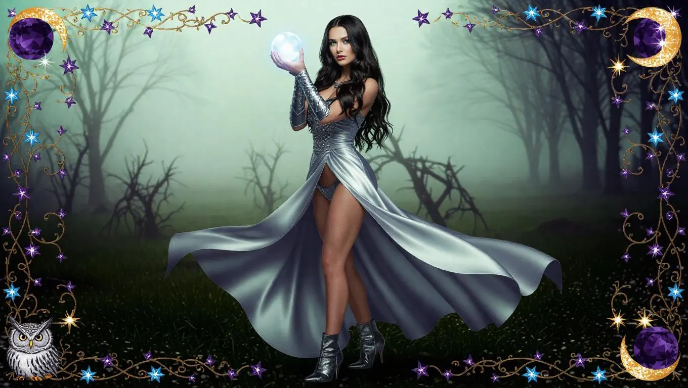 A bewitching sorceress with fiery eyes, wearing a flowing silver gown and ankle boots, holds a glowing crystal orb while standing in a misty meadow. Twisted vines and shimmering stars create an enchanting ambiance. The card border features owl and crescent moon motifs, accented with gold and blue decorations, and adorned with amethyst.