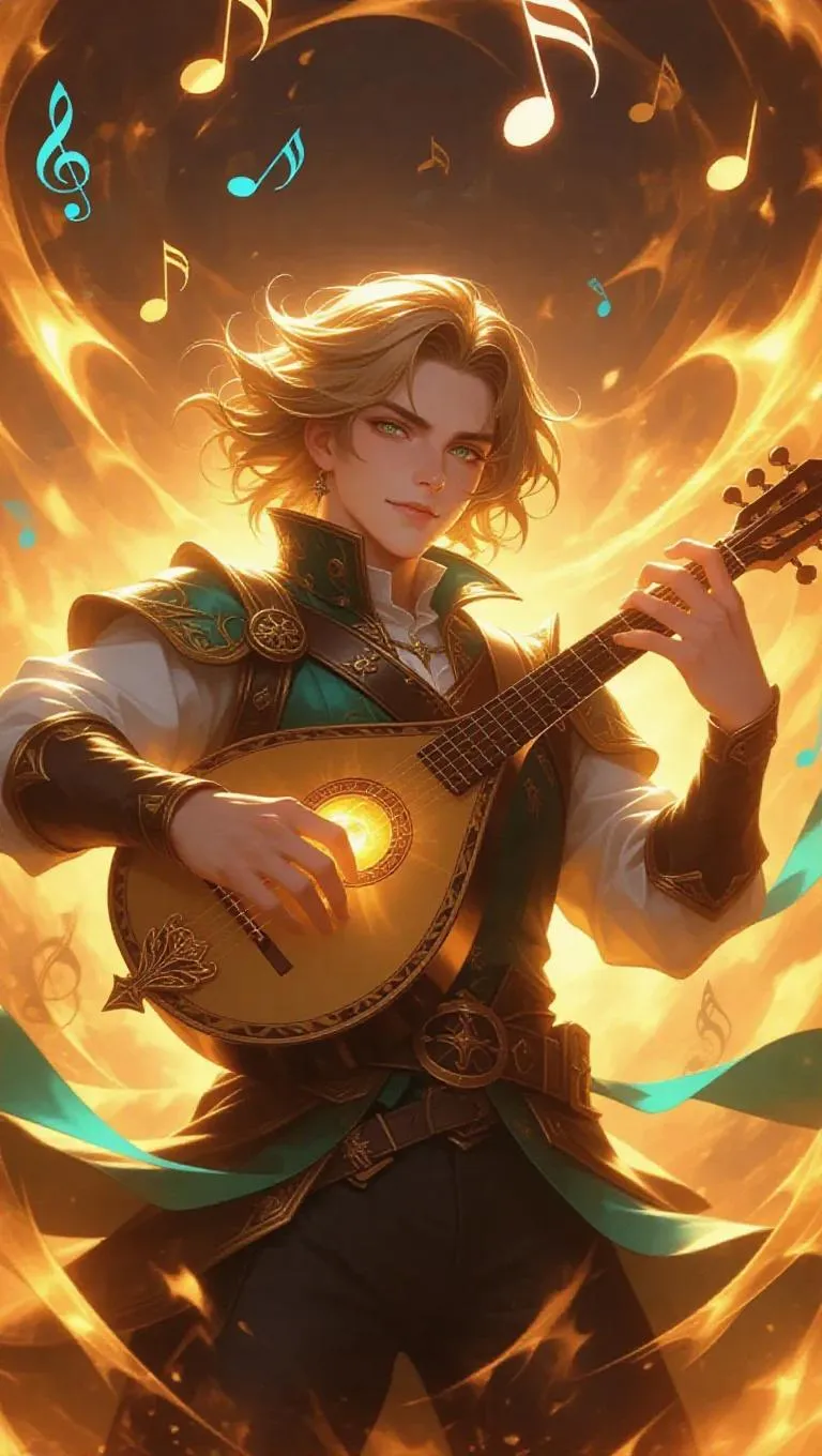 An adventurous bard with flowing golden hair and twinkling green eyes strums a fiery lute, surrounded by musical notes and shimmering sparkles. The background is a swirling maelstrom of flames and rhythm, with a collectible game card design that features a lively turquoise frame, melodic fire-element symbols, vibrant attire, and a glowing soundwave texture. The lighting is radiant, with joyful highlights from the flames and soft shadows from the notes, crafting a lively and festive atmosphere. The style is playfully detailed and enchanting, merging realism with musical motifs.