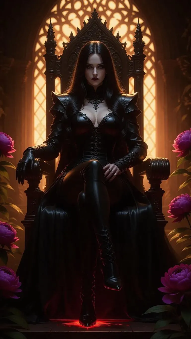 A gothic vampire character with piercing grey eyes and textured attire stands by an ornate throne, surrounded by spirits and peonies. Blood runes glow beneath their feet. The scene is set in an illuminated, mystic chamber with intricate thorn carvings adorning the borders, giving the image a shimmering sunset gloss. Soft, ambient lighting casts eerie shadows, enhancing the mystical and foreboding atmosphere. The style is dark fantasy, blending realism with gothic elegance.