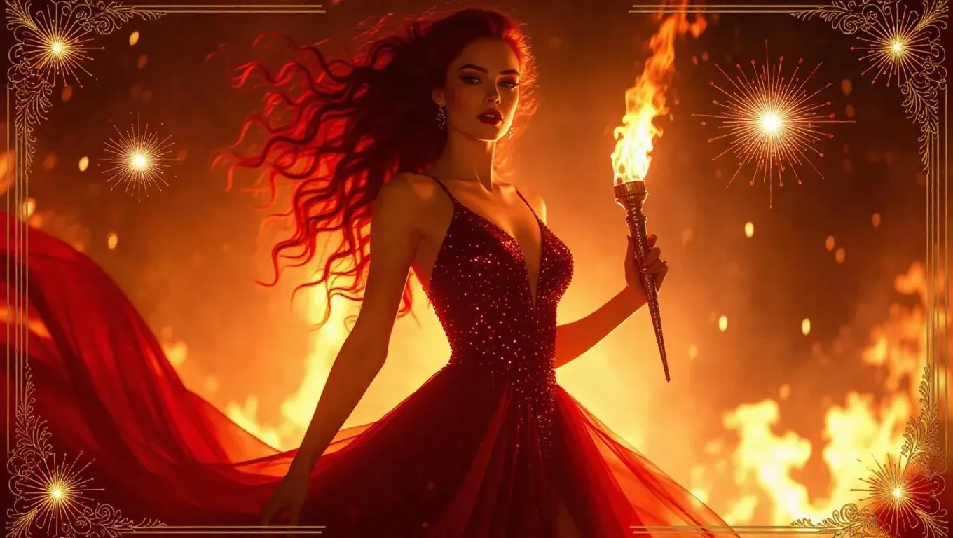 A fiery goddess with wild crimson hair, wearing a molten ruby gown that shines brilliantly. She holds a blazing torch while standing amidst roaring flames. The background showcases a fiery carnival scene with sparkling fireworks. The card border integrates intricate flame and sunburst motifs, accented with glimmering red and vibrant gold decorations, and adorned with radiant garnet.