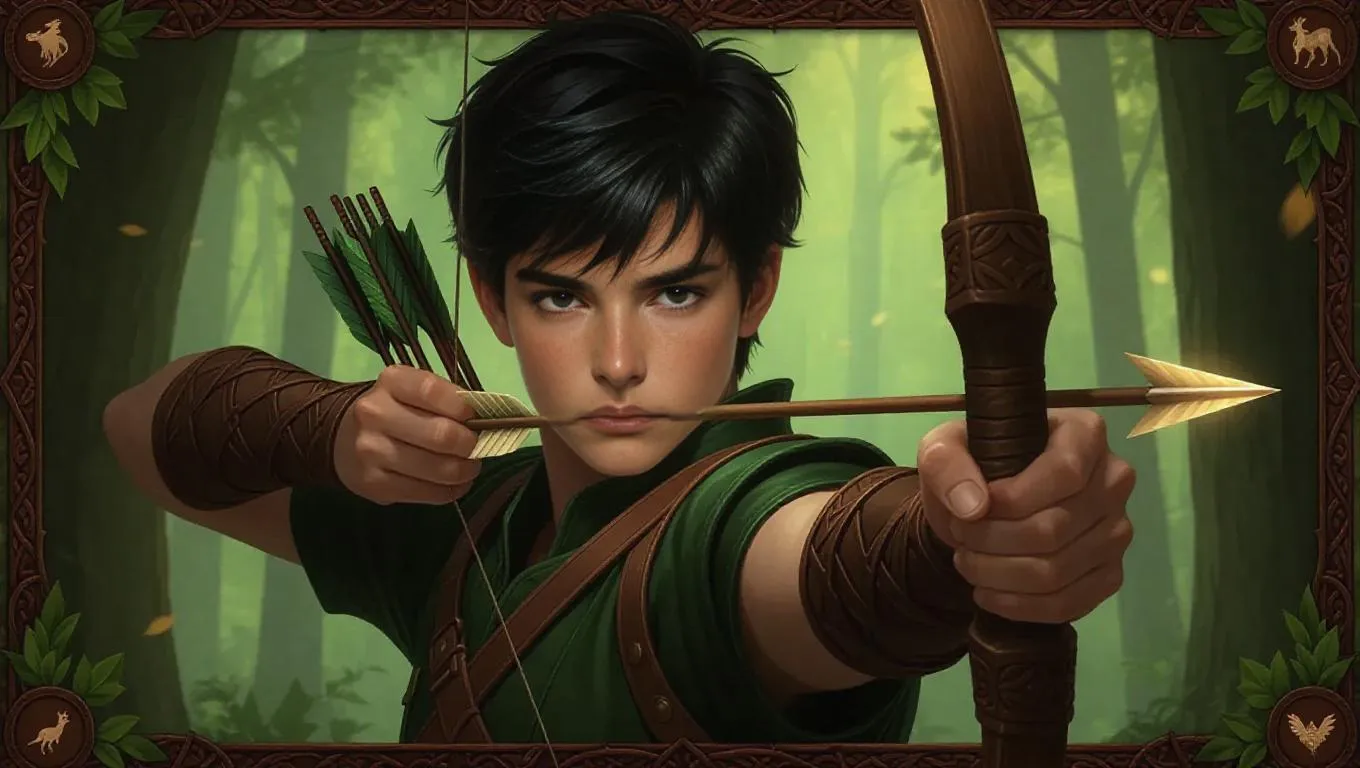 A youthful male archer with short black hair and sharp, focused brown eyes, clad in a dark green outfit with a quiver of arrows and a flexible recurve bow. He takes aim, and a magical arrow with a glowing tip is poised for release. The dense forest background features tall trees and rustling leaves, framed by a rustic wooden border adorned with animal patterns and hunting insignias, exuding a natural, earthy texture. Soft lighting, subtle glows, and a sense of adventure create a captivating collectible card game-style image.