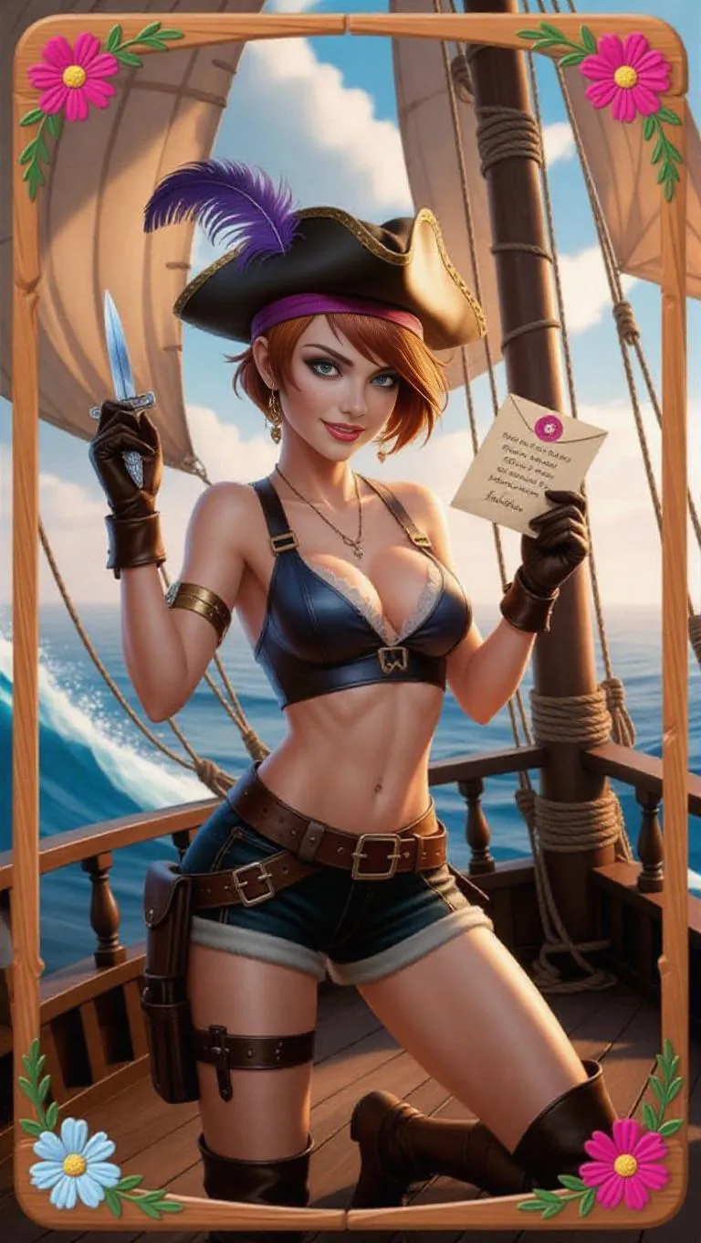 A daring female pirate with short, fiery orange hair and a lively, shimmering blue eye (with a feather in her hat), dressed in a revealing crop top, short pants, and a stylish headband. She wields a shiny dagger and clutches a sealed letter, standing on the deck of an antique ship with rippling sails and a vast, open ocean in the background. The card is framed by a charming wooden border adorned with floral designs and playful symbols, featuring a soft, natural texture. The image is meticulously detailed, with soft, diffused lighting, glistening water effects, and a playful, adventurous spirit, presenting a delightful masterpiece in the style of collectible card games.