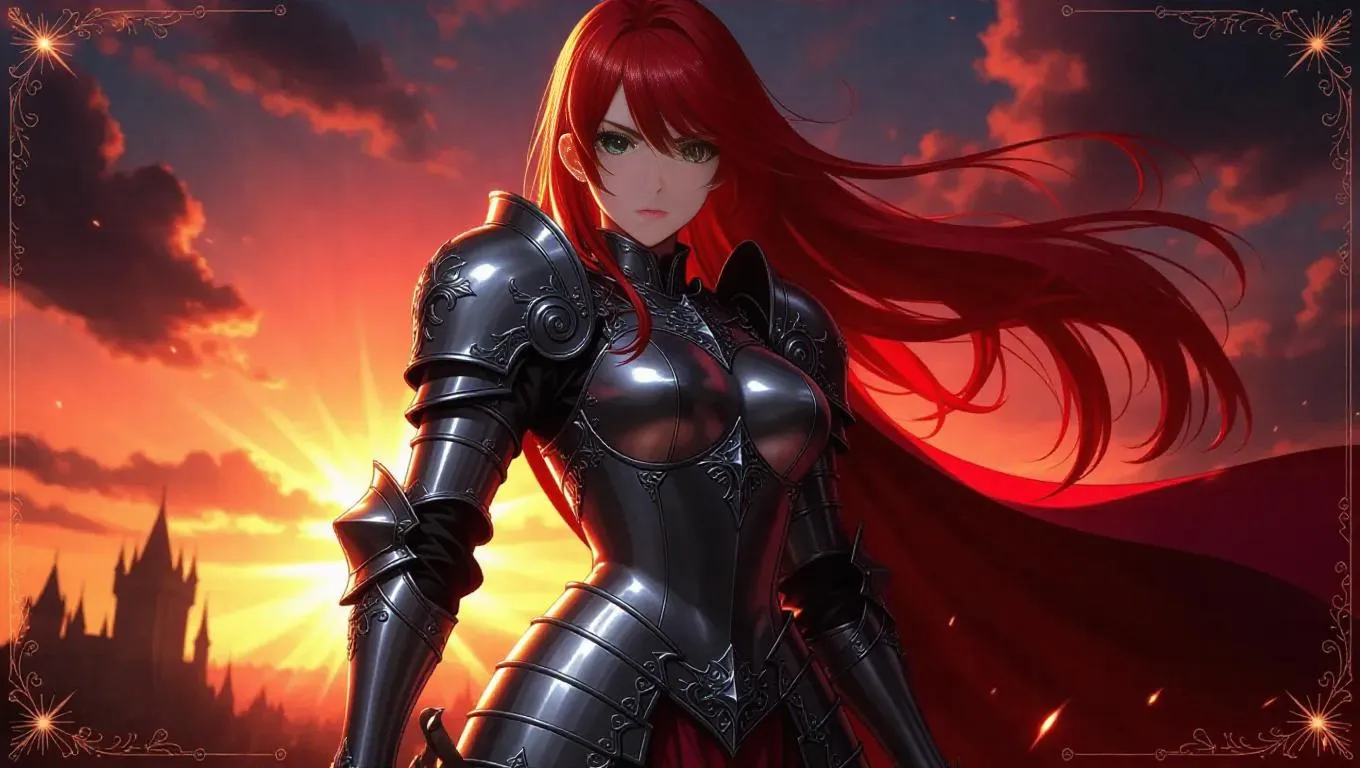 A fierce anime-style female knight, clad in silver armor with intricate engravings, stands in a commanding pose. Her long red hair flows freely, and her emerald eyes gleam with determination. The background features a setting sun casting crimson rays, surrounded by dark clouds. The card border is radiant, with starburst patterns, mystical symbols, and a holographic finish, accented by silver vines and sparkling crystals.