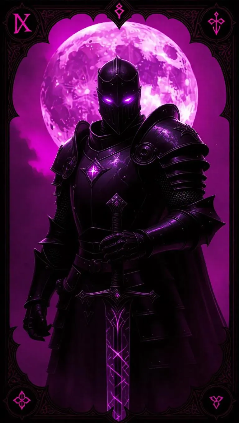 A corrupted knight stands under a blood moon, his battle-worn armor and cursed black sword reflecting the eerie glow. His single glowing purple eye pierces the darkness. The game card border features elaborate gothic shapes, dark charcoal tones, blood runes, and a legendary light-element mark with radiant glowing effects. Side light casts deep shadows, enhancing the knight's ghostly presence. Style: Gothic horror.