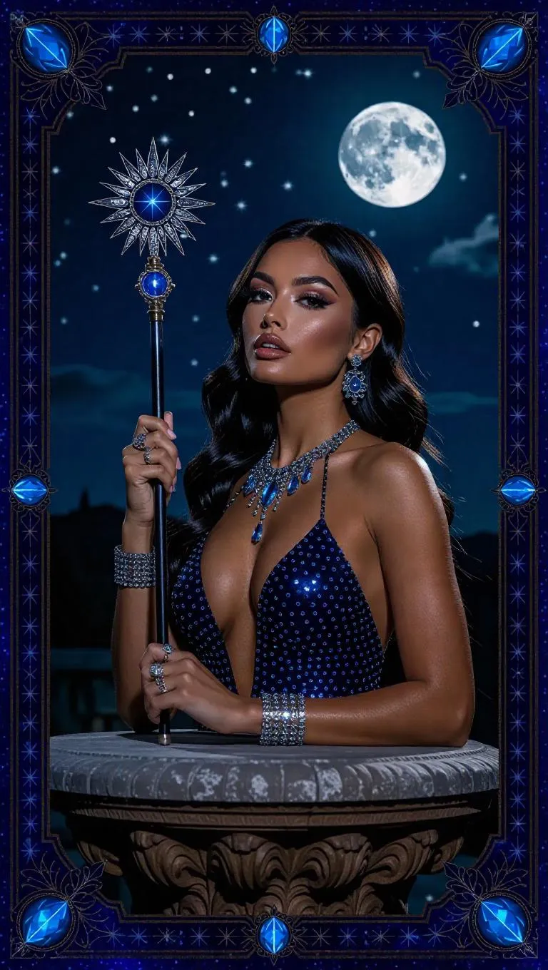 An exotic beauty with radiant skin, wearing a shimmering, beaded dress that glistens under the stars, holding a jeweled staff while standing powerfully atop a stone altar. The background showcases a starry night sky with a bright full moon, casting a mystical light. The card border integrates intricate star and sun motifs, accented with midnight blue and silver decorations, and adorned with sparkling opal.