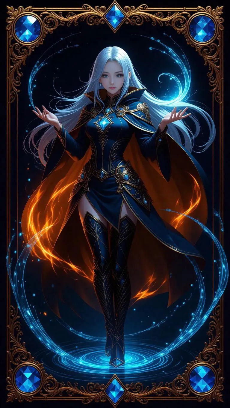 A stunning anime-style female mage, dressed in a regal cloak adorned with elemental symbols, stands in a dynamic pose, casting a spell. Her long silver hair glows with a faint indigo light, and her piercing green eyes radiate determination. Swirling water, fire, and wind elements surround her, with glowing runes illuminating the scene. The card border is ornate, with intricate gold filigree, embedded topazes, and holographic shimmer, framed by swirling elemental motifs.