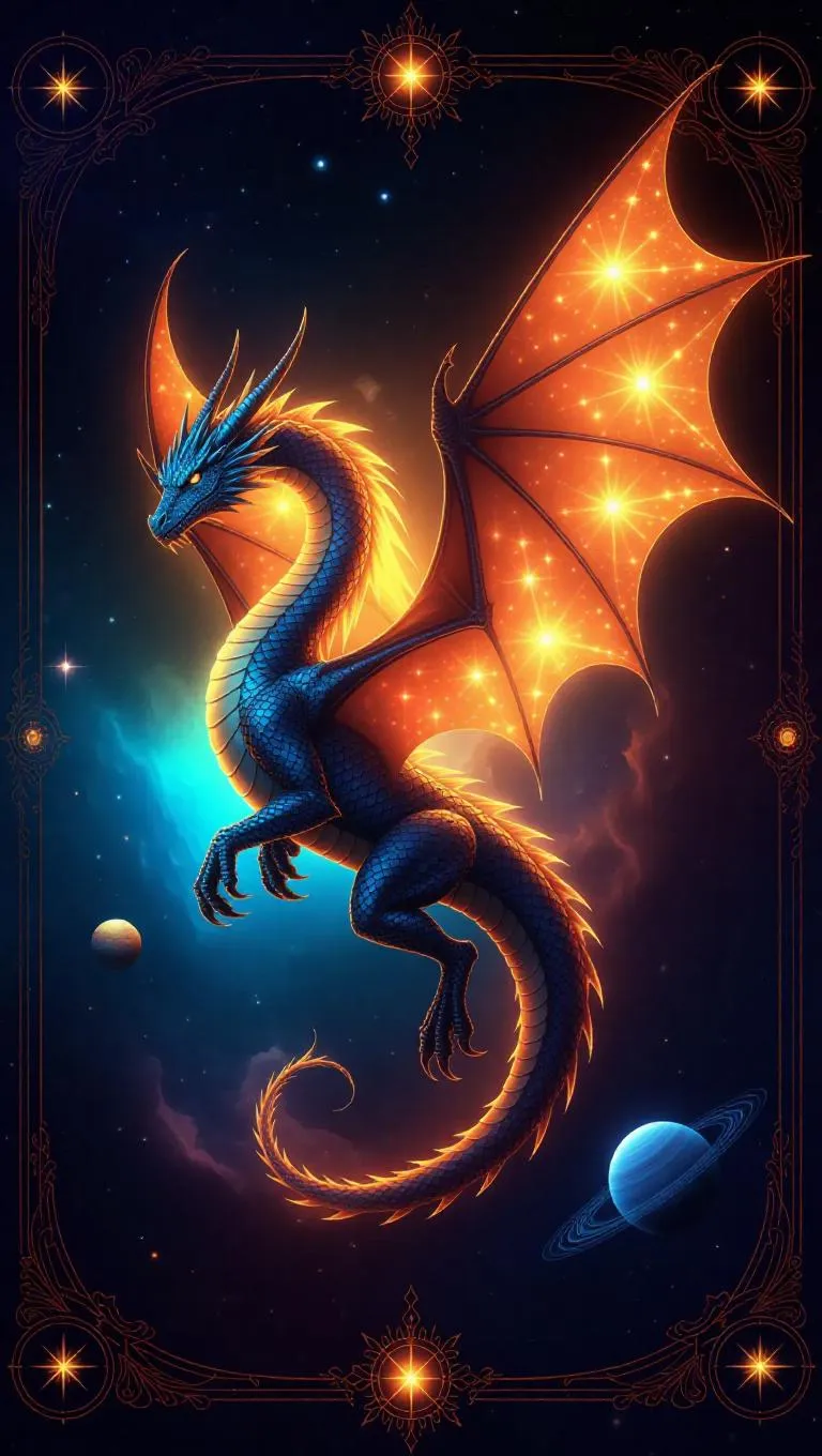 A celestial dragon rises from stardust, its wings ablaze with nebula flames. Supernovas and orbiting planets fill the card background, while the frame glimmers with radiant galaxy colors and aurora effects, adorned with stellar runes. Soft, warm light illuminates the dragon, casting a glow that highlights the intricate details of its scales. The style is fantastical and ethereal, blending realism with cosmic elements.