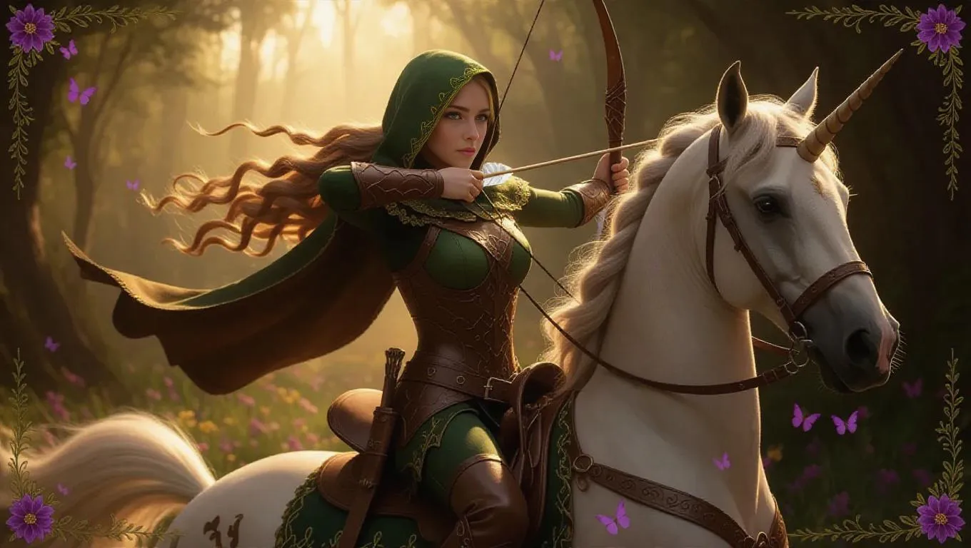 A noble female elven ranger with braided, golden locks and keen emerald green eyes, dressed in lightweight, leaf-patterned leather armor with earthy brown accents and a hooded cloak. She rides a graceful unicorn, leaping through an enchanted glade with a bow drawn tight. The background features a serene meadow filled with colorful flowers and fluttering fairies, edged by a delicate floral border decorated with nature motifs and elven lore. Gentle lighting, playful shadows, and a serene, whimsical mood create a picturesque scene reminiscent of fairy tales.