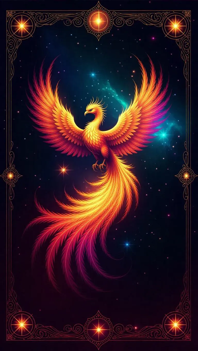 A celestial phoenix rises from stardust, its feathers ablaze with nebula flames. Supernovas and pulsating stars fill the card background, while the frame radiates with vibrant galaxy colors and aurora effects, adorned with radiant runes. Soft, ambient light illuminates the phoenix, casting a glow that highlights the intricate details of its plumage. The style is vibrant and ethereal, blending realism with cosmic elements.