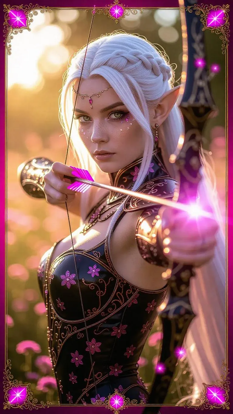 A cunning elven archer queen with jade green eyes and platinum white hair stands in an enchanted meadow. She wears flower-patterned enchanted armor and holds a glowing bow made of twilight. The scene is adorned with meadow runes, dancing motes of light, and an ornate ruby border featuring ethereal glyphs. Bright pink and gold holographic light shimmers around her, casting a mystical glow.