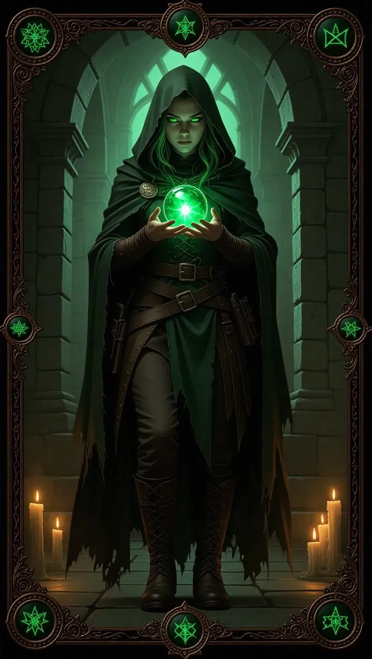 A mysterious sorceress with emerald green eyes, dressed in a tattered cloak and combat boots, holds a glowing crystal orb while standing in a haunted castle. Dark stones and flickering candles create a haunting ambiance. The card border features wolf and rune motifs, accented with green and bronze decorations, and adorned with jade.