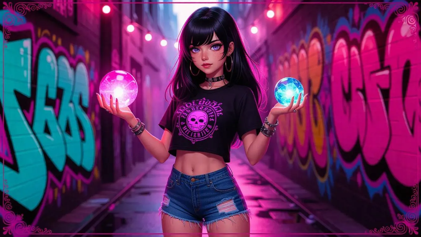 A nostalgic sorceress with soft pink eyes, dressed in a vintage rock band tee and denim shorts, holds a glowing crystal orb while standing in a graffiti alley. Bright murals and pulsating music create an urban ambiance. The card border features music note and spray can motifs, accented with vibrant colors, and adorned with tourmaline.
