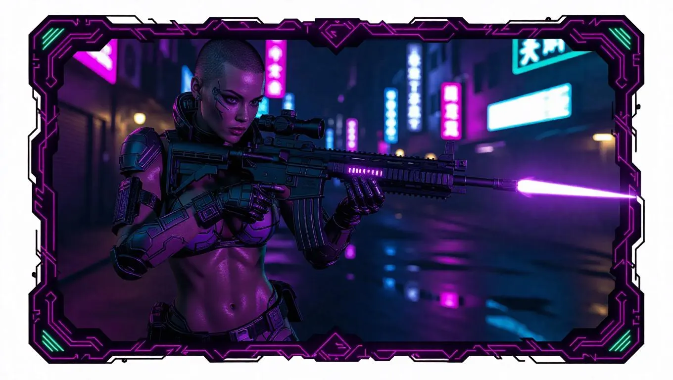 A fierce huntress with a buzz cut, wearing an industrial-style bikini and tactical armor. She holds a futuristic laser gun, positioned on a deserted cyberpunk street. Neon signs and distorted reflections frame the scene. The card border showcases digital motifs and neon patterns, accented with dark purple and electric green decorations, and adorned with luminous circuit stones.