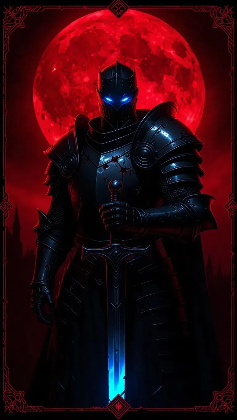 A corrupted knight stands under a blood moon, his chipped armor and cursed black sword reflecting the eerie glow. His single glowing blue eye pierces the darkness. The game card border features sharp mechanical shapes, shadowy black tones, blood runes, and a legendary gravity-element mark with pulsing glowing effects. Side light casts intense shadows, enhancing the knight's looming presence. Style: Gothic horror.