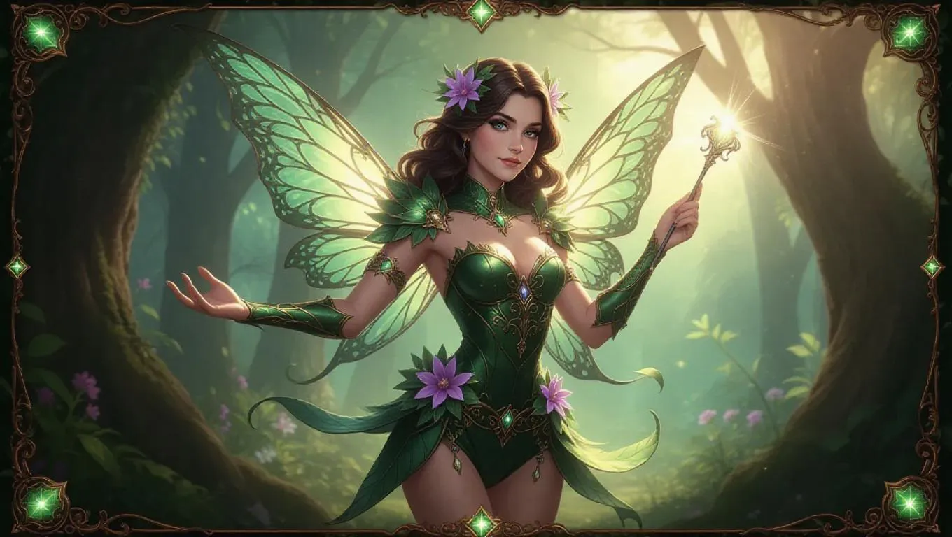 An ethereal fairy guardian floats in the air, wings elegantly fluttering, and a wand sparkling with nature magic. Her floral armor blends with the scenery, and the background reveals an enchanted forest. The game card features a whimsical border with swirly patterns, green foil textures, and a magical light glow.