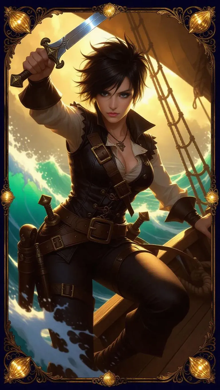 A daring pirate lady with short spiky hair, wearing a rugged vest and flexible pants, exuding action and adventure. She holds a sturdy blade while positioned in the crow’s nest of her ship, with crashing waves and golden rays of sunlight creating an exhilarating mood. The card border exhibits artistic waves and seashell patterns, enriched with dark blue and golden highlights, and decorated with sparkling citrines.