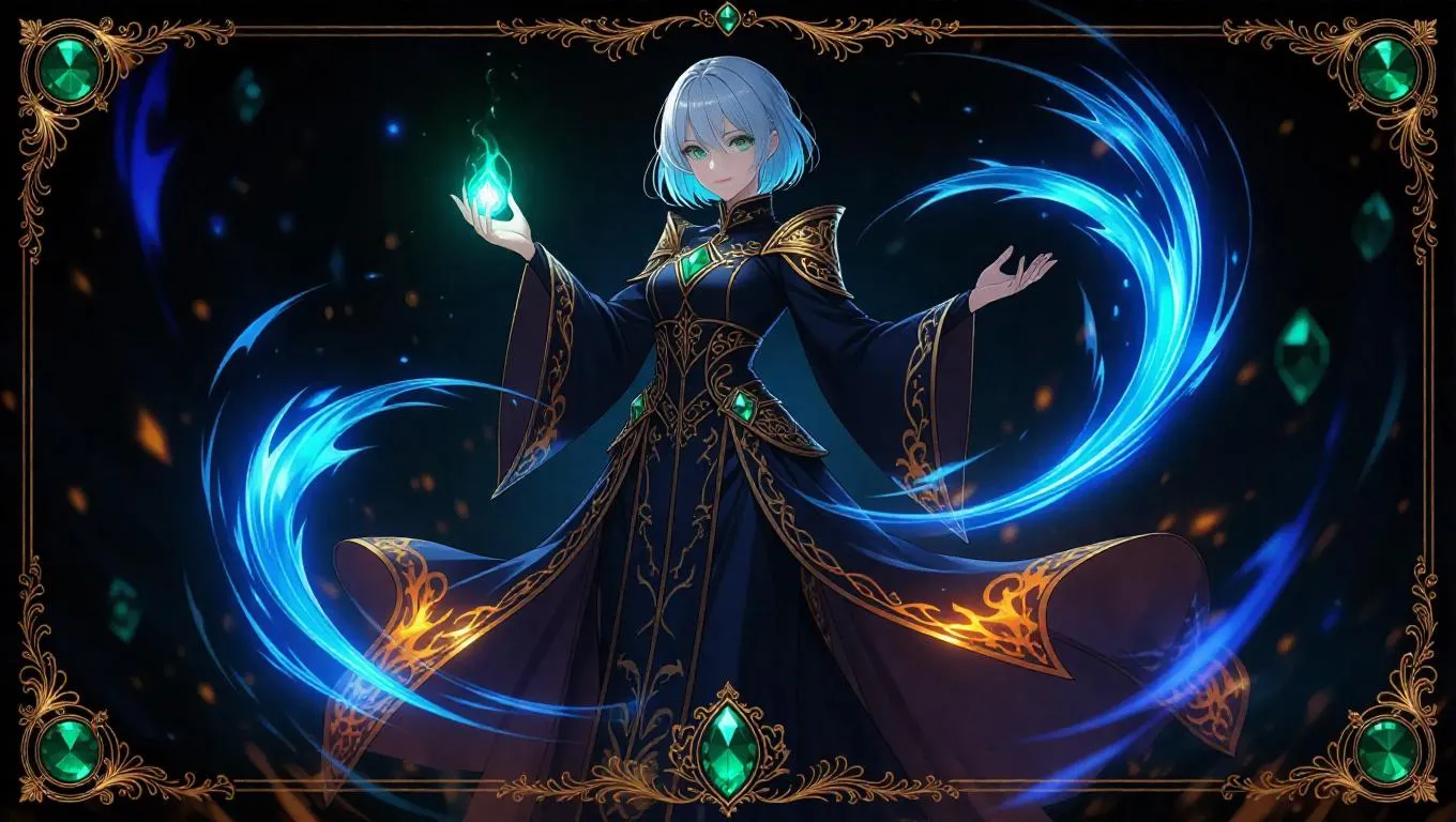 A stunning anime-style female mage, dressed in flowing robes adorned with fire symbols, stands in a dynamic pose, casting a spell. Her short silver hair glows with a faint blue light, and her piercing green eyes radiate confidence. Swirling water, fire, and wind elements surround her, with glowing runes scattered around. The card border is ornate, with intricate gold filigree, embedded emeralds, and holographic shimmer, framed by swirling elemental motifs.