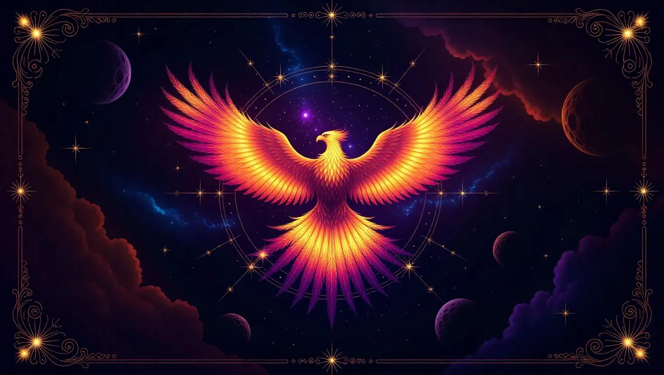 A celestial phoenix rises from stardust, its silhouette ablaze with nebula flames. Supernovas and drifting asteroids fill the card background, while the frame glistens with radiant galaxy colors and aurora effects, adorned with stellar runes. Soft, cool light illuminates the phoenix, casting a glow that highlights the intricate details of its feathers. The style is whimsical and ethereal, blending realism with cosmic elements.