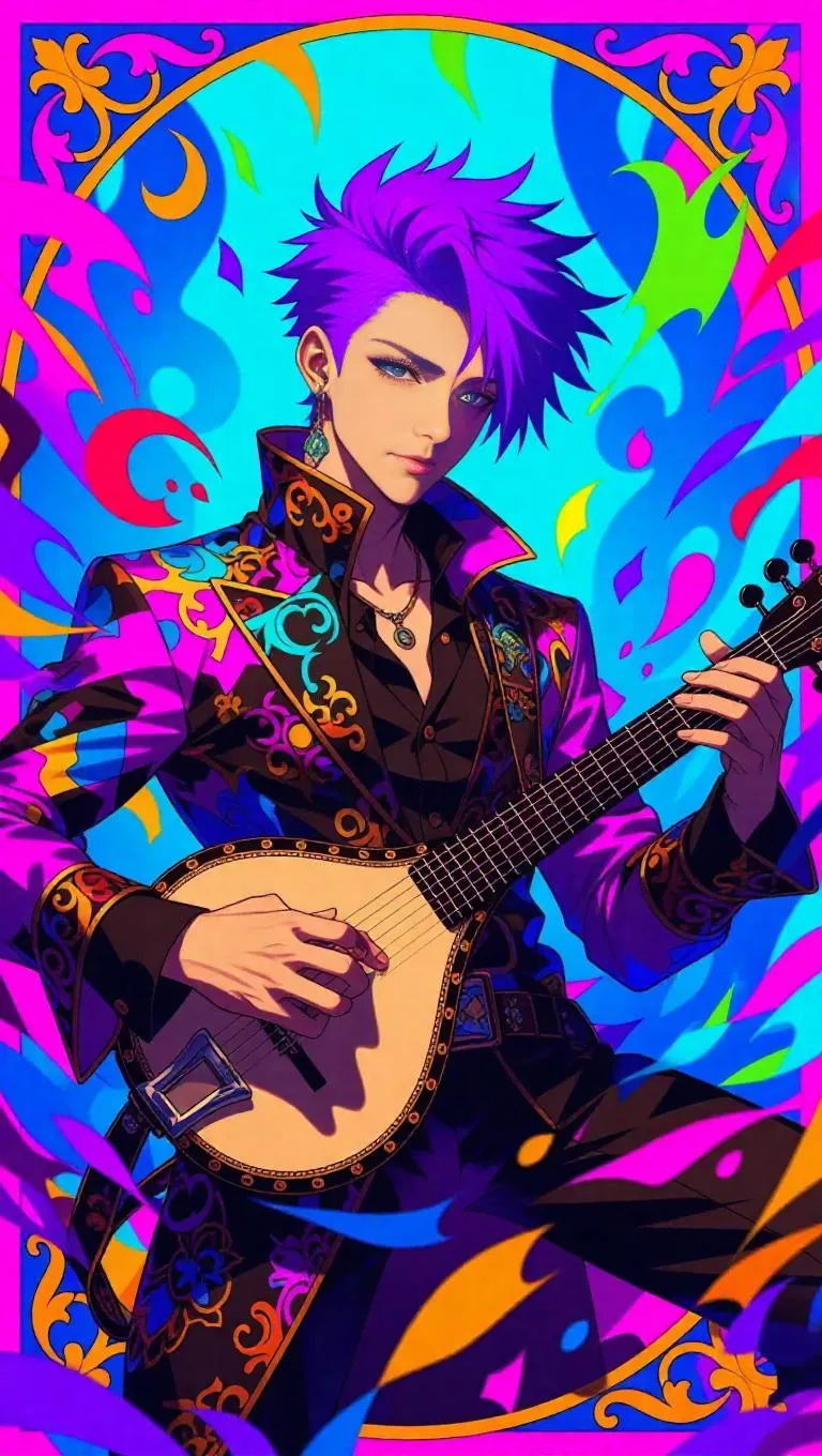 A whimsical male bard with spiky violet hair and dreamy teal eyes, dressed in an artistic, patchwork outfit adorned with van Gogh-style swirls and colors. He plays a psychedelic sitar, creating colorful sound waves, accompanied by moving paint splashes and artistic symbols. The imaginative art studio background features colorful canvases and paintbrushes, encircled by a colorful border with artistic carvings and floral designs. Bright lighting, colorful contrasts, and an artistic charm create an innovative, visually captivating scene in the style of modern art.