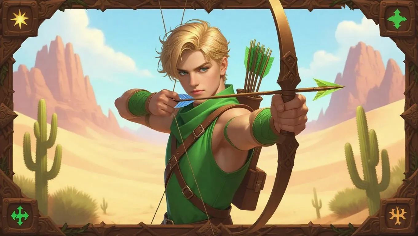 A youthful male archer with sandy blonde hair and sharp, focused green eyes, clad in a bright green outfit with a quiver of arrows and a powerful bow. He takes aim, and a magical arrow with a glowing tip is poised for release. The dense desert background features shimmering sand dunes and distant mountains, framed by a rustic wooden border adorned with cactus patterns and hunting insignias, exuding a natural, earthy texture. Soft lighting, subtle glows, and a sense of adventure create a captivating collectible card game-style image.