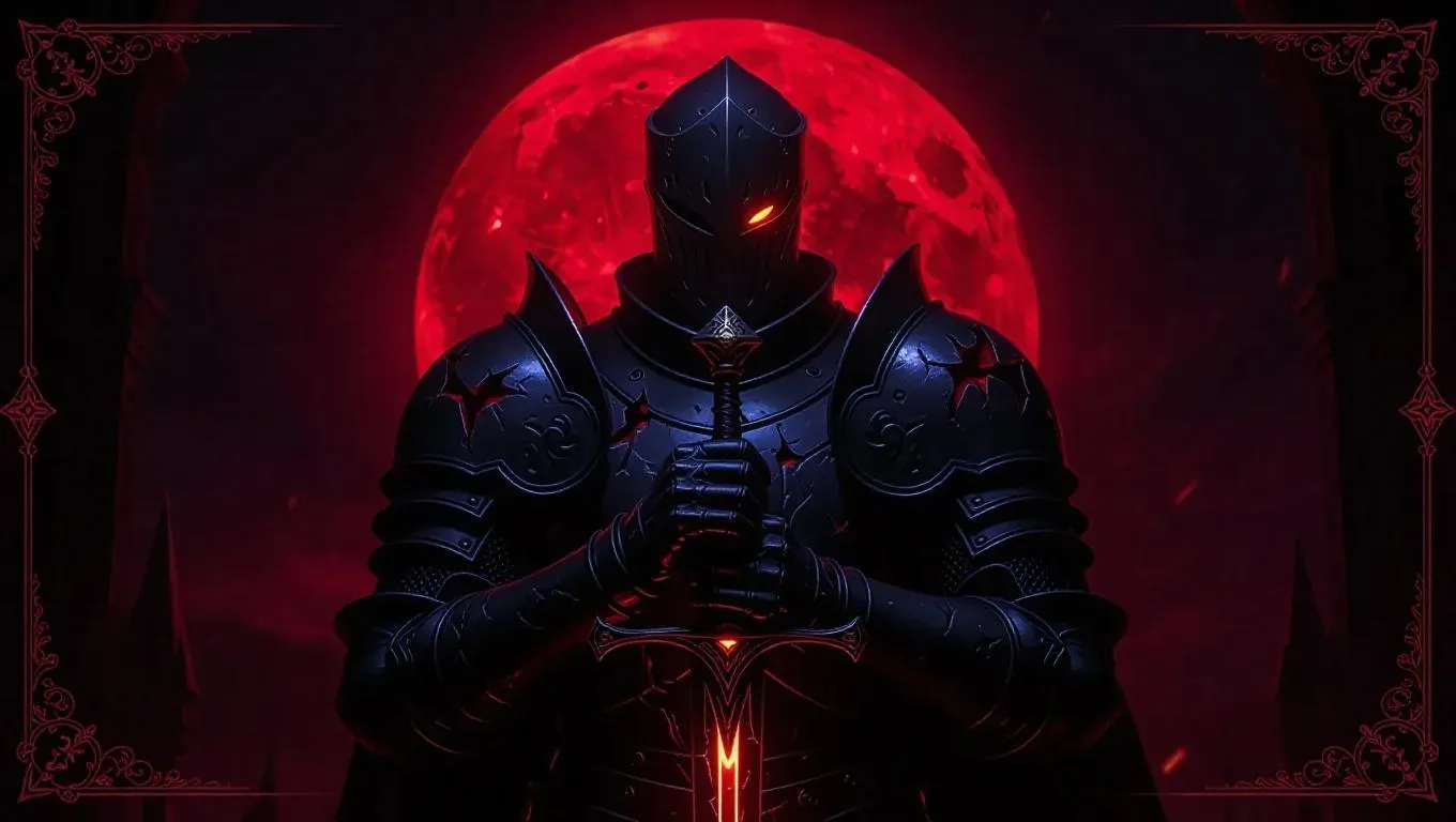 A corrupted knight stands under a blood moon, his shattered armor and cursed black sword reflecting the eerie glow. His single glowing gold eye pierces the darkness. The game card border features ornate victorian shapes, deep indigo tones, blood runes, and a legendary illusion-element mark with flickering glowing effects. Side light casts subtle shadows, enhancing the knight's ghostly presence. Style: Dark fantasy.