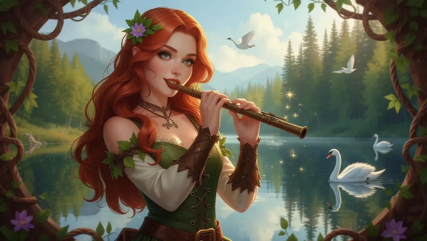 A charming female bard with straight red hair and playful green eyes, dressed in a muted, earthy outfit adorned with vines and leaves. She plays a magical flute, emitting haunting melodies, surrounded by swirling wisps and shimmering stars. The serene lakeside background is dotted with graceful swans and whispering trees, encircled by a rustic stone border with nature carvings and starry motifs. Soft lighting, tranquil glows, and a soothing charm create a calming, intricate scene in the style of fantasy illustrations.