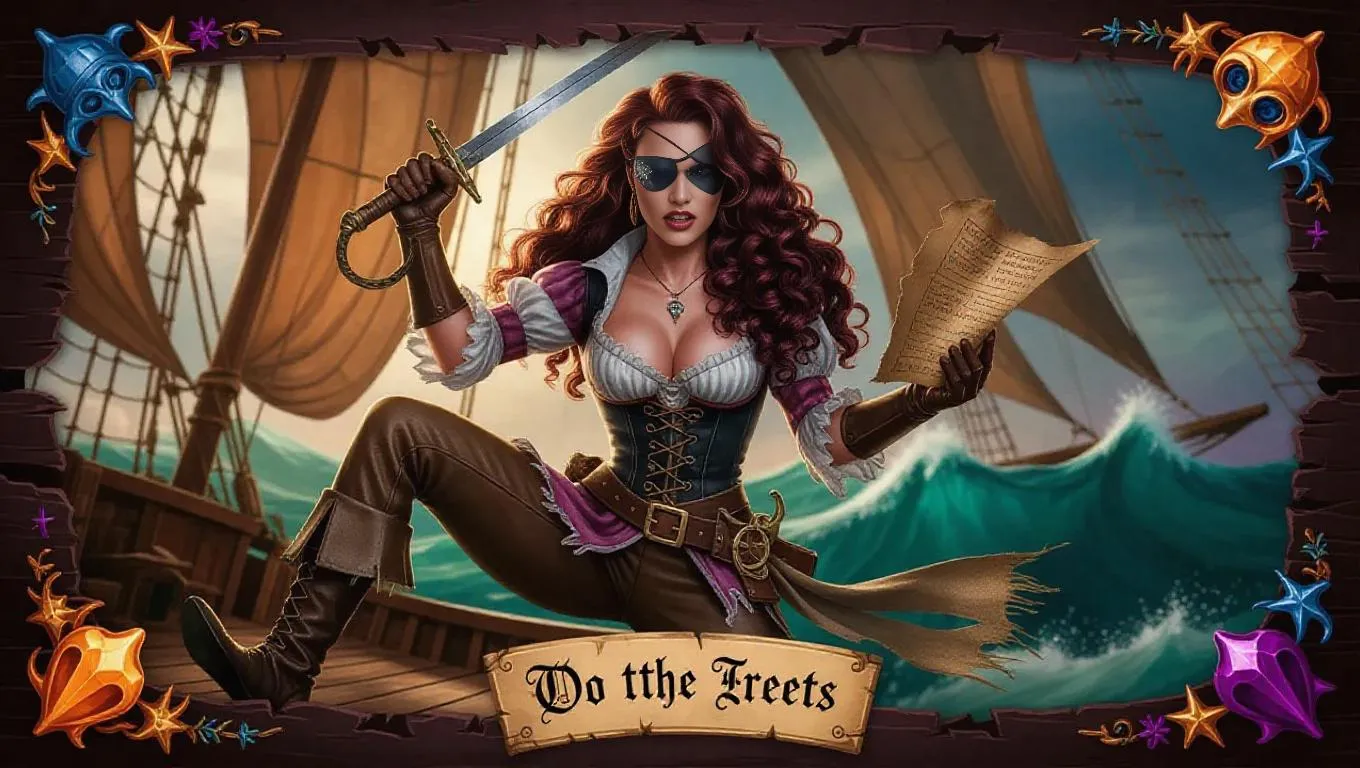 A rugged female pirate with long, curly auburn hair and a fierce, stormy brown eye (with a jeweled eye patch on the other), dressed in a frilly bodice, leather britches, and a tattered scarf. She wields a dull sabre and clutches an old, crumpled map, standing on the deck of a weather-beaten ship with flapping sails and a fierce, crashing sea in the background. The card is framed by a dark, rough-hewn wooden border adorned with sea creature symbols and assorted treasures, featuring a bold, textured appearance. The image is intricately detailed, with shadowy, stormy lighting, crashing water effects, and a fierce, adventurous spirit, presenting an impressive masterpiece in the style of collectible card games.