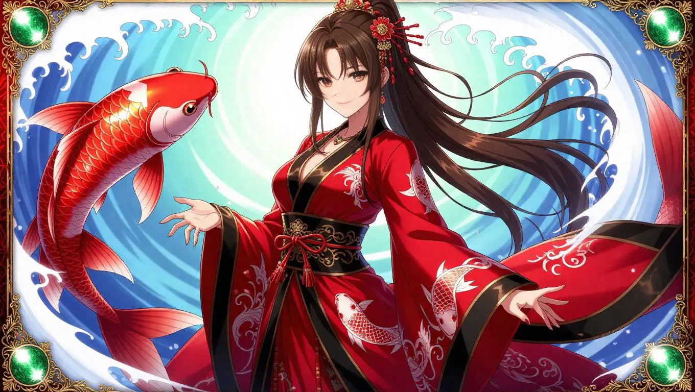 A majestic anime-style female empress, dressed in a flowing red and black robe adorned with intricate koi motifs, stands in a powerful pose. Her long brown hair is styled with elegant red hairpins, and her glowing amber eyes radiate unparalleled power. The background showcases a swirling koi and tranquil waters. The card border is ornate, featuring intricate koi and water patterns, engraved Chinese characters, a holographic shimmer, and accented with jade gemstones and golden filigree.
