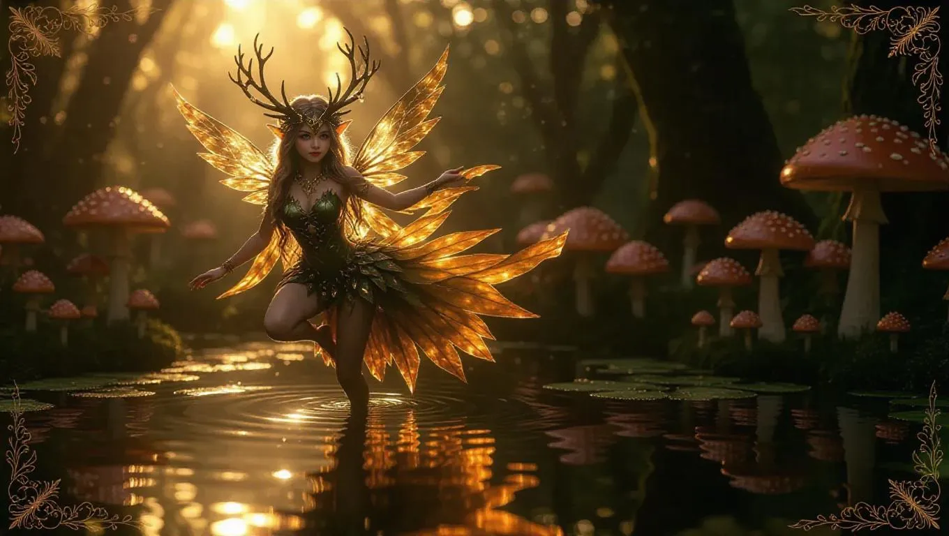 A forest spirit girl with golden crystal antlers floats over a magical pond, surrounded by enchanted mushrooms and sparkling dew. Her ethereal form is adorned with luminous, flowing garments, and her eyes sparkle with a vibrant, mystical glow. The pond reflects the enchanting forest, with warm, dappled sunlight seeping through the foliage. The collectible card features nature-themed filigree borders, moss emblems, and a rich golden-orange holographic shine, enhancing the ultra-detailed enchanted forest background.